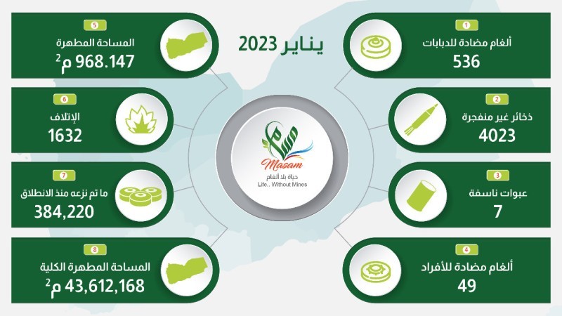 أصدر المركز الإعلامي لمشروع «مسام» لنزع الألغام في اليمن تقريره الشهري، عن يناير 2023، حيث بلغ عدد الألغام التي نزعها فريق «مسام» 4,615 من الألغام والذخائر غير المنفجرة والعبوات الناسفة، التي زرعتها مليشيا الحوثي في عدد من المحافظات اليمنية.