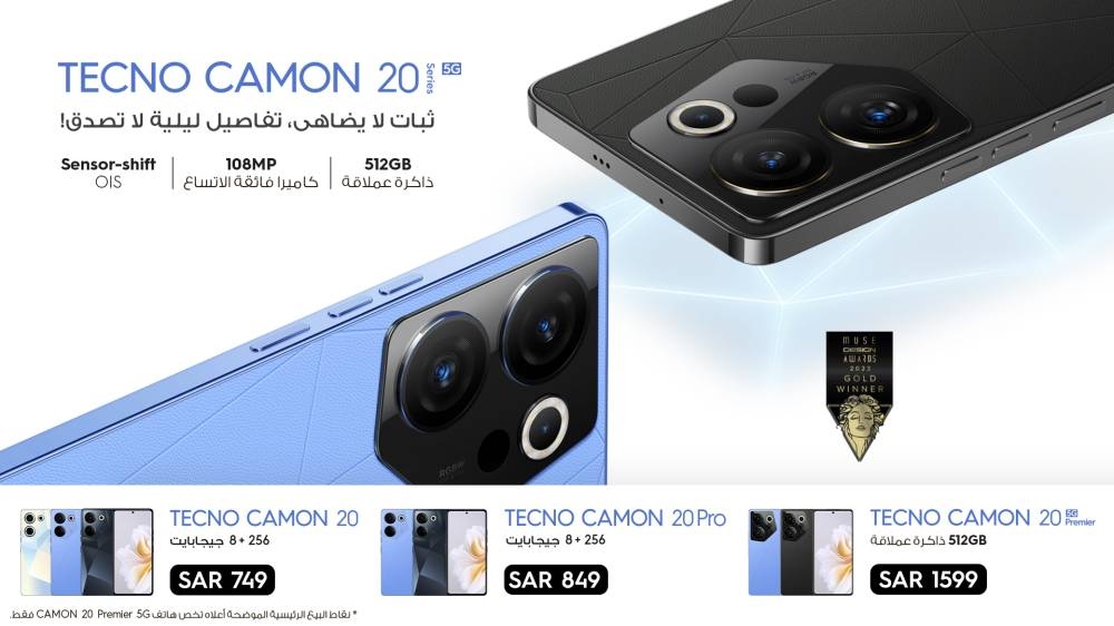 تقدم TECNO مجموعة متنوعة من هواتفها الذكية بأسعار مختلفة وتصاميم متنوعة. تتوفر هذه الهواتف بعدة خيارات للألوان، بما في ذلك Dark Welkin و Serenity Blue، بالإضافة إلى لون جديد يسمى Glacier Glow Glass مخصص لهاتف CAMON 20. ابتداءً من 17 مايو، توفرت سلسلة هواتف CAMON 20 بثلاثة إصدارات: CAMON 20 وCAMON 20 Pro وCAMON 20 Premier 5G للحجز المسبق في المملكة العربية السعودية مع هدايا رائعة من خلال اكسترا، نون، أمازون لولو هايبر ماركت ونيستو بسعر يبدأ من 749 ريالا سعوديا. وسيتم طرحها في جميع الأسواق حول المملكة بتاريخ 24 مايو 2023.