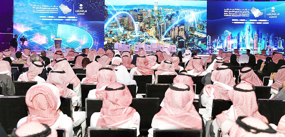 مشاركون في مؤتمر إدارة المخاطر والطوارئ يستمعون إلى المناقشات. (واس)