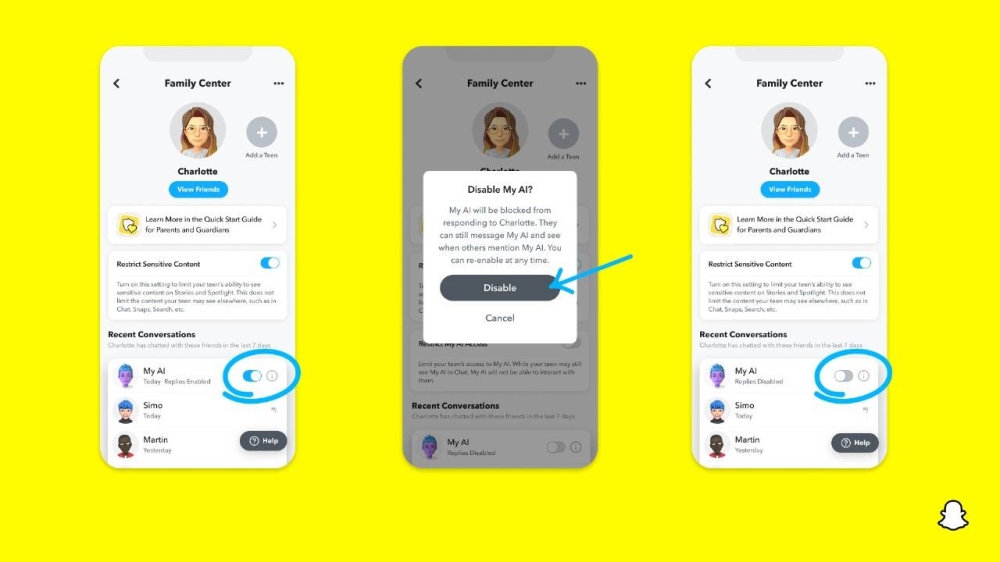 الرقابة الأبوية لمحادثات الذكاء الاصطناعي: يُمكن للآباء الآن تقييد قدرة ميزة الدردشة بالذكاء الاصطناعي My AI، على الرد على المحادثات التي يقوم بها الأبناء المراهقون. تعتمد هذه الميزة على وسائل الحماية المتضمنة بالفعل في ميزة الدردشة My AI، بما في ذلك الحماية من الإجابات غير المناسبة أو الضارة، وفرض القيود المؤقتة على الاستخدام في حالة إساءة استخدام الخدمة بشكل متكرر، إضافة إلى مراعاة العمر بشكل افتراضي.