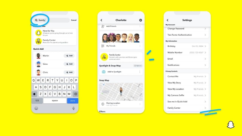 الوصول السهل إلى مركز العائلة: بالنسبة للآباء الذين قد لا يكونون على معرفة تامة بكيفية استخدام المنصة، حرصت سناب شات على تسهيل آلية الوصول إلى مركز العائلة، إذ يمكن للآباء الآن الوصول إلى مركز العائلة مباشرة من خلال التوجه إلى أيقونة الإعدادات الموجودة في الزاوية العلوية اليمنى من الملف الشخصي للوالد.