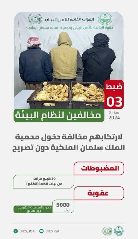 ضبطت القوات الخاصة للأمن البيئي 3 مواطنين مخالفين لنظام البيئة، لارتكابهم مخالفة دخولهم المناطق المحمية دون تصريح في محمية الملك سلمان الملكية بمنطقة تبوك، وضبطت بحوزتهم أكثر من 20 كيلوغرامًا من الكمأ (الفقع).
