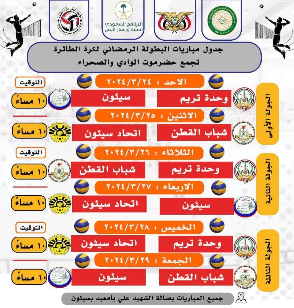 انطلقت اليوم بطولة حضرموت الرمضانية لكرة السلة وبطولة كرة الطائرة في محافظة حضرموت، برعاية البرنامج السعودي لتنمية وإعمار اليمن، بمشاركة 17 نادياً و289 شاباً لكرة السلة، وكذلك بمشاركة 10 أندية و140 شاباً لكرة الطائرة.