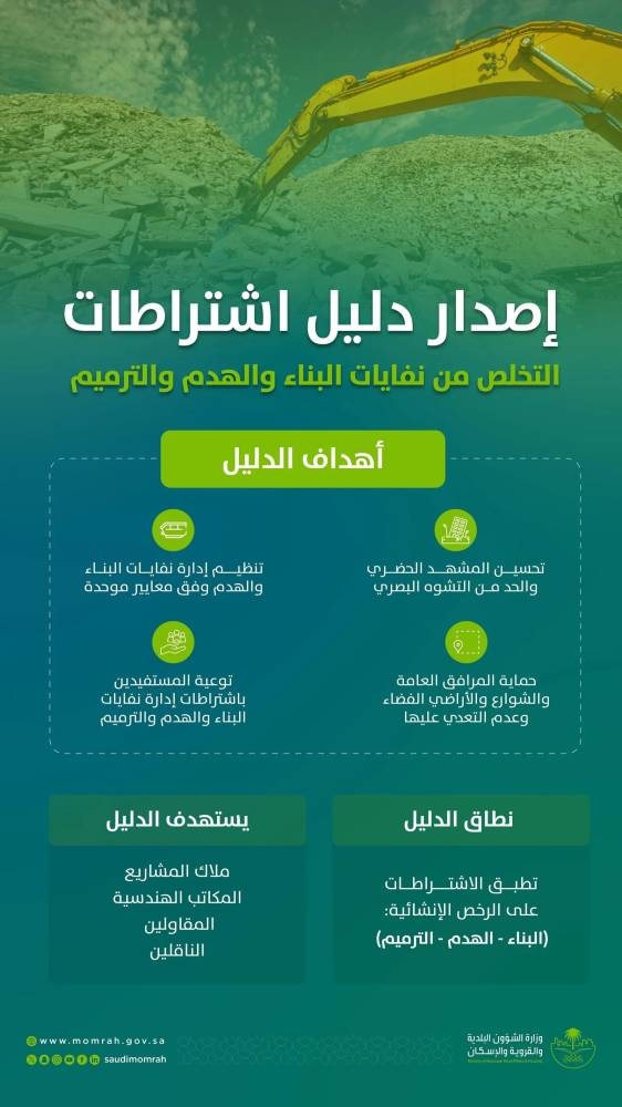 ودعت وزارة الشؤون البلدية والقروية والإسكان ملاك المشاريع والعقارات والمكاتب الهندسية والمقاولين والناقلين للاطلاع على دليل «اشتراطات التخلص من نفايات البناء والهدم والترميم» المتضمن عدداً من المتطلبات والأحكام المتنوعة، وذلك من خلال زيارة الرابط: