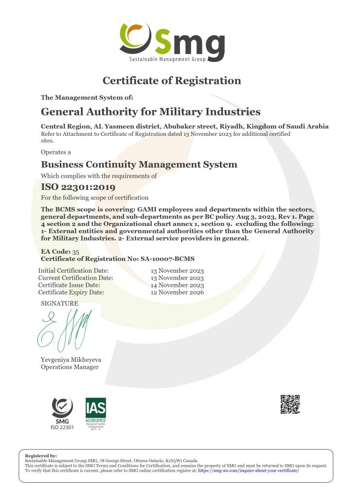 يذكر أن حصول الهيئة العامة للصناعات العسكرية على شهادة الآيزو في تطبيق المعايير الدولية لنظام استمرارية الأعمال (ISO22301:2019) يعكس حرصها على تعزيز ثقافة استمرارية الأعمال ورفع مستوى المرونة التنظيمية داخل الهيئة، وتصميم برنامج شامل ومتوافق مع أولوياتها الاستراتيجية في إدارة الأزمات والحالات الطارئة، وبناء الثقة داخل القطاع بشأن القدرة على أداء العمليات، والامتثال للمتطلبات والمعايير المحلية والدولية.