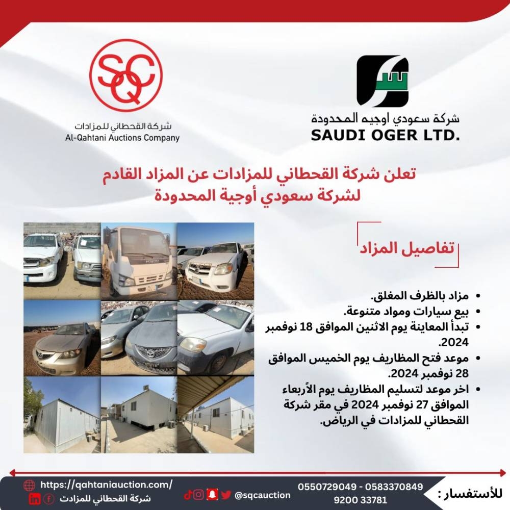 تعلن شركة القحطاني للمزادات عن مزادها القادم لشركة سعودي أوجيه المحدودة