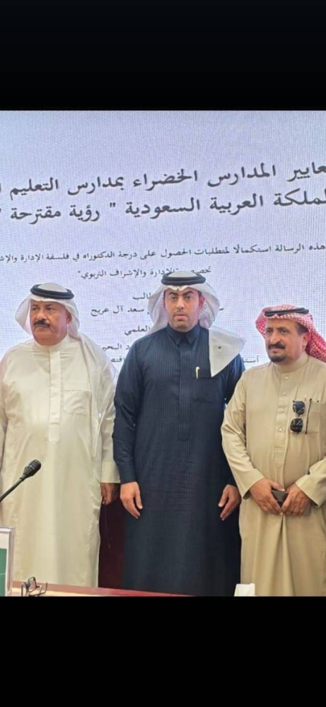 حصل المشرف التربوي في تعليم منطقة عسير سعد بن عبدالله آل عريج على شهادة الدكتوراه من جامعة الملك خالد في القيادة والسياسات التربوية. وشهد جلسة مناقشة رسالة الدكتوراه عدد من الأهل والأصدقاء.
