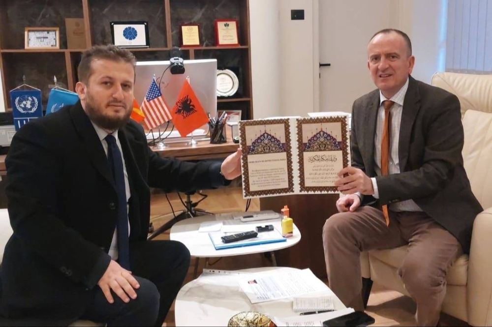 استقبل وزير الصحة في جمهورية مقدونيا الشمالية الدكتور أربين تارافاري، في مكتبه بديوان الوزارة، رئيس جمعية مجموعة (آرت) الشيخ نصرت رمضان، الذي قدّم له خلال اللقاء، نسخة مترجمة من وثيقة مكة المكرمة.