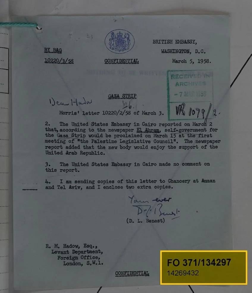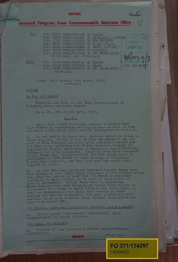 كشفت وثائق بريطانية سرية، رُفع عنها السرية مؤخرًا ونشرها الأرشيف الوطني البريطاني، عن تفاصيل جديدة حول قطاع غزة في أعقاب العدوان الثلاثي عام 1956، وكشفت الوثائق عن خطة مصرية لإعادة تنظيم القطاع كجزء من رؤية لإقامة دولة فلسطينية، في إطار سعي الرئيس عبد الناصر لتحقيق الوحدة العربية، التي تجسدت لاحقًا في تأسيس الجمهورية العربية المتحدة مع سوريا عام 1958.