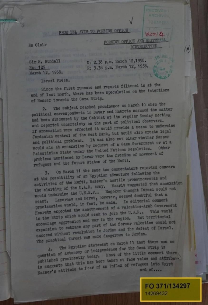 تشمل الوثائق التي رفع عنها السرية مراسلات بين السفارة البريطانية في القاهرة ووزارة الخارجية في لندن، إلى جانب تقارير استخباراتية من 1957 و1958، تظهر قلق بريطانيا من تصاعد نفوذ عبد الناصر بعد انتصاره السياسي في أزمة السويس، وتفيد إحدى الوثائق بأن لندن اعتبرت الخطة المصرية «تهديدًا مباشرا» لمصالحها في الشرق الأوسط، خاصة مع تزايد شعبية القضية الفلسطينية بعد نزوح حوالي 200 ألف لاجئ إلى غزة إثر نكبة 1948، وفقا لتقديرات الأمم المتحدة آنذاك، كما كشفت الوثائق عن ضغوط بريطانية على الأمم المتحدة لإجهاض المشروع، خوفا من أن يعزز مكانة مصر كقائدة للحركة القومية العربية.