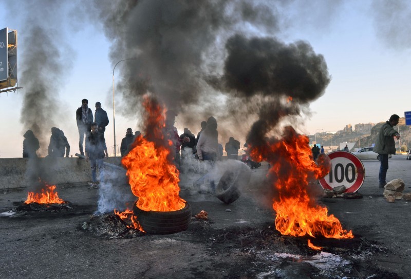 متظاهرون لبنانيون يشعلون الإطارات ويقطعون طريقا في طرابلس أمس. (أ.ف.ب)