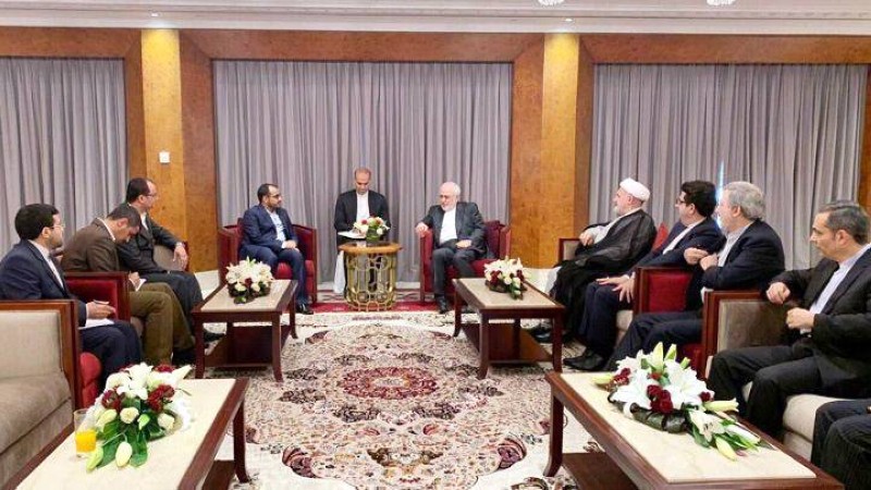 صورة نشرها إعلام الحوثي عن لقاء وزير الخارجية الإيرانية ظريف برئيس وفد الحوثيين محمد عبدالسلام في مسقط، أمس.