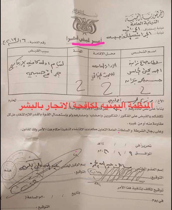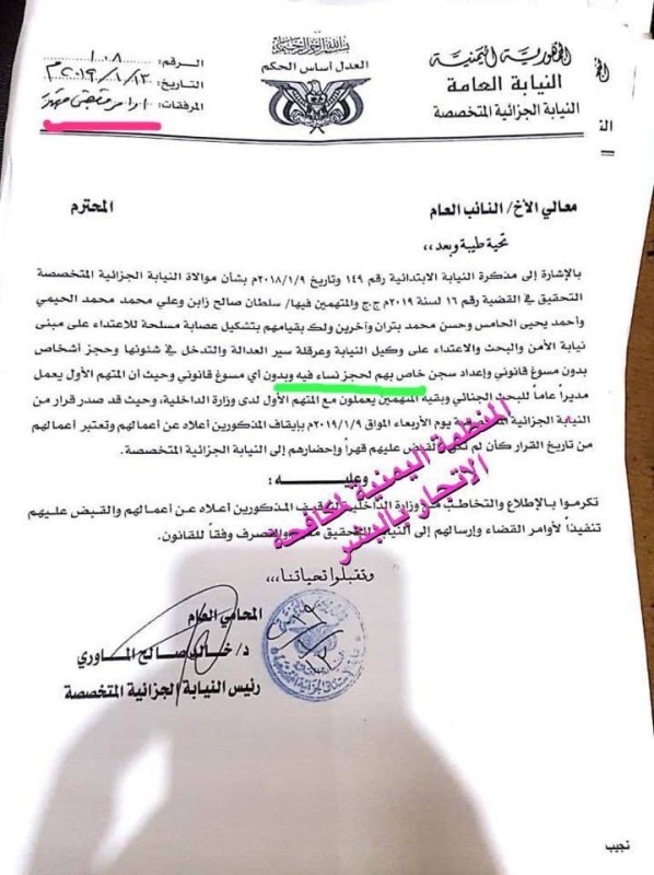 كما عرضت المنظمة وثيقة للنائب العام الحوثي يوجه اتهاما للقيادات الحوثية «زابن، بتران، محمد الحيمي، وأحمد الحامس» بتشكيل عصابات مسلحة والاعتداء على وكيل النيابة المكلف بالتحقق من وجود سجون سرية للنساء والاعتداء عليهن.