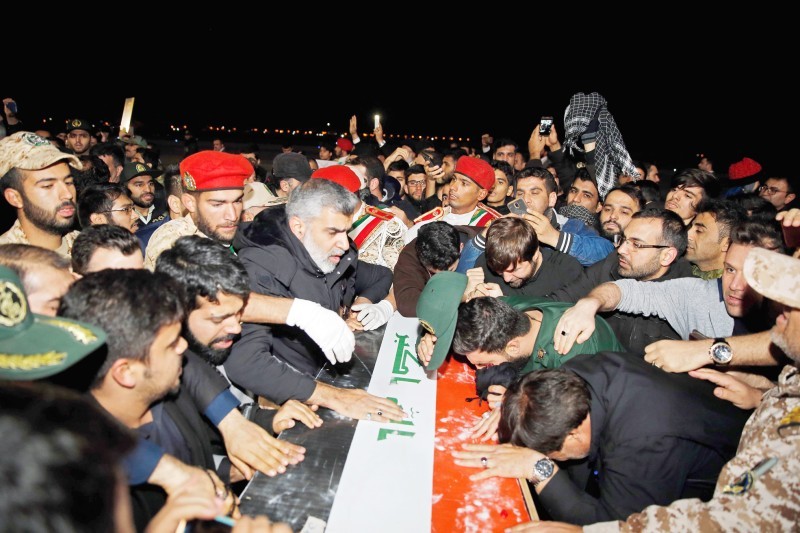 إيرانيون يحملون نعش سليماني والمهندس في مطار الأحواز الدولي في طهران أمس. (أ.ف.ب)
