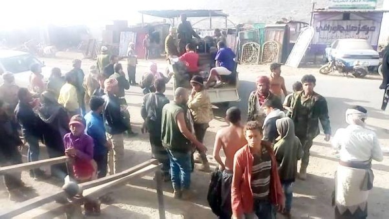 يمنيون في حالة هلع قرب المعسكر الذي استهدفه صاروخ حوثي بالضالع أمس. (متداولة)