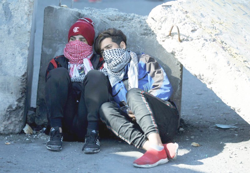 محتجان عراقيان يأخذان قسطاً من الراحة قرب أحد الجسور في وسط بغداد، أمس الأو.ل (أ.ف.ب)