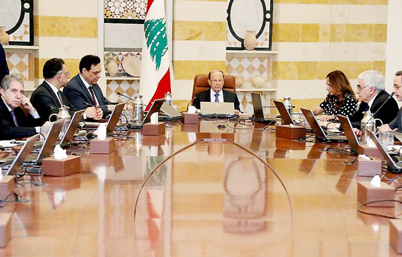 عون مترئسا جلسة مجلس الوزراء لإقرار بيان الحكومة أمس. (عكاظ)
