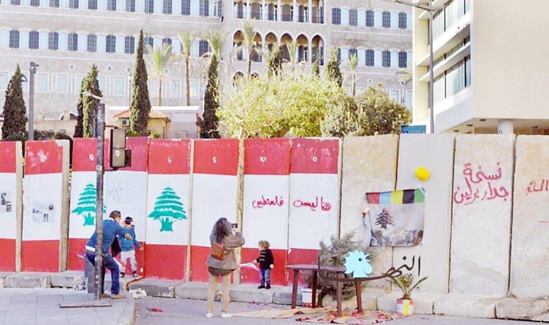 جدار إسمنتي حول السراي الحكومي لمنع وصول المتظاهرين. (عكاظ)