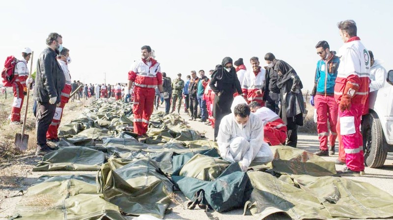 مسعفون إيرانيون يجمعون أشلاء ضحايا الطائرة الأوكرانية المنكوبة. (وكالات)
