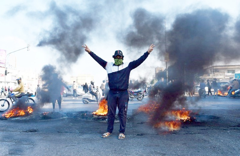 عراقي يؤشر بعلامة النصر أمام إطارات محترقة لإغلاق طريق خلال مظاهرة ضد علاوي في مدينة الناصرية جنوب العراق أمس. (وكالات)