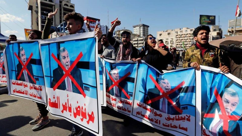 متظاهرون يرفعون لافتات وشعارات ترفض تكليف علاوي (رويترز)