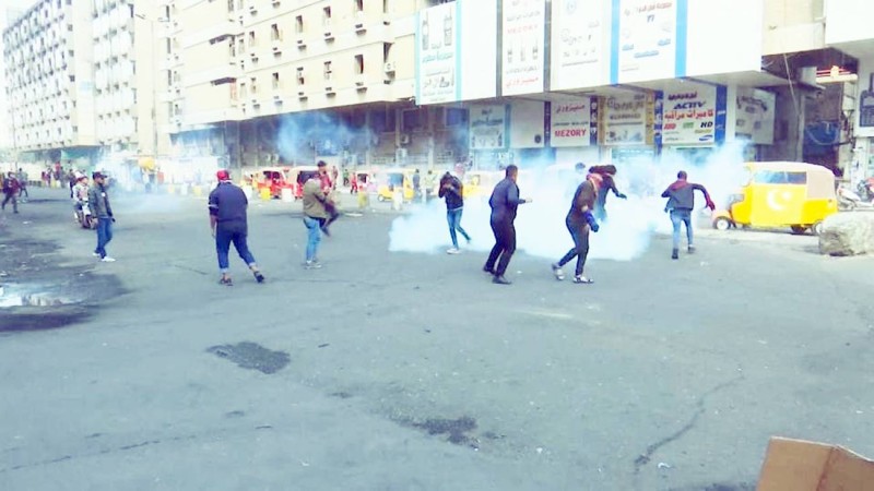 وتشهد ساحة الخلاني وسط بغداد صدامات بين المتظاهرين وقوات مكافحة الشغب بعد إعلان البرلمان تأجيل جلسة التصويت على الحكومة الجديدة لعدم اكتمال النصاب.