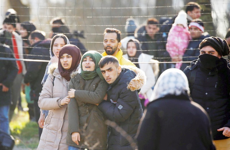 مهاجرون سوريون في طريقهم لعبور الحدود التركية اليونانية أمس. (وكالات)