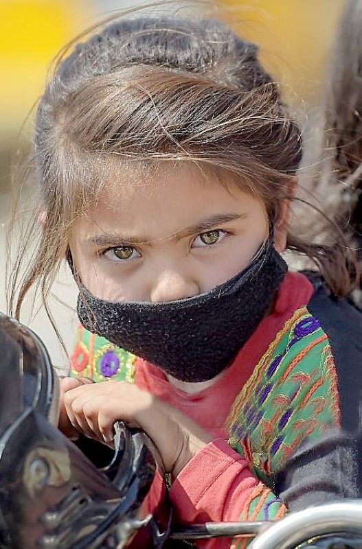 طفلة باكستانية ترتدي الكمامة خشية فايروس كورونا الذي دفع إسلام أباد إلى إغلاق حدودها البرية. (أ.ف.ب)