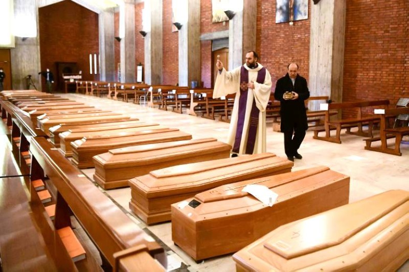 نعوش لضحايا كورونا في كنيسة بإيطاليا أمس الأول .(أ.ف.ب)