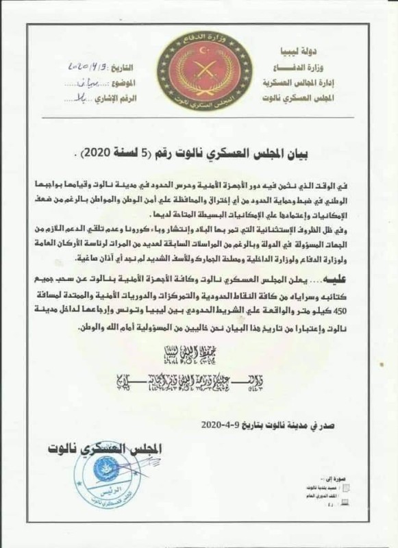 وسط تقدم الجيش الليبي بقيادة المشير خليفة حفتر، أعلنت مليشيا المجلس العسكري لمدينة نالوت التابع لقوات حكومة الوفاق في طرابلس، سحب كتائبه ومسلحيه من النقاط الحدودية والتمركزات الأمنية الواقعة على الشريط الحدودي بين تونس وليبيا، احتجاجا على غياب الدعم من الجهات المسؤولة.