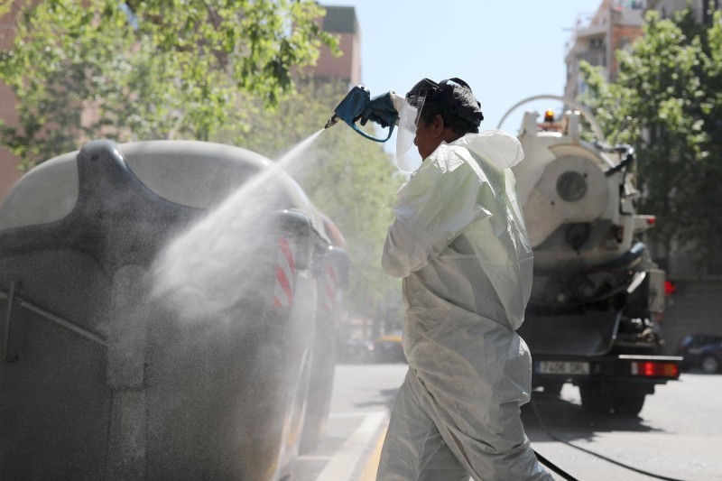 عامل يعقم سلة قمامة في مدريد اليوم. (وكالات)