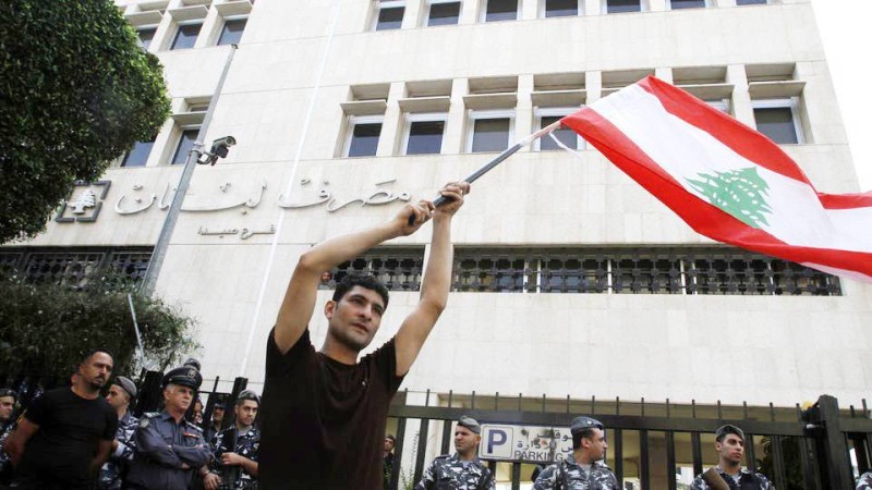 لبناني يرفع علم بلاده خلال احتجاجات على تردي الأوضاع المعيشية أمام البنك المركزي في العاصمة بيروت.