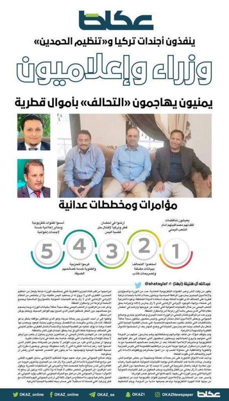 وكانت «عكاظ» قد نشرت يوم الجمعة الماضي (15 رمضان الجاري) تقريراً موسعا تحت عنوان (وزراء وإعلاميون يمنيون يهاجمون «التحالف» بأموال قطرية)، تحدث من خلاله عدد من المراقبين المهتمين بالشأن اليمني، عن وزراء وإعلاميين يمنيين يمارسون المراهقة السياسية، ويشنون حملات كاذبة بأجندات تركية قطرية على التحالف الذي تقوده المملكة بهدف استعادة الدولة المختطفة، وعودة الشرعية إلى صنعاء، وإنهاء الوجود الإيراني الإرهابي الذي لازال يمارس إذلاله وإجرامه بحق الشعب اليمني من خلال المليشيات الحوثية التي تخلت عن عروبتها وارتمت في أحضان نظام الملالي الذي يسعى بائساً إلى زعزعة أمن واستقرار المنطقة، إضافة إلى ما يملكون من سجلات حافلة بالتناقضات، التي تكشف تغليب مصالحهم الشخصية على حساب القضية اليمنية، التي تشغل بال العالم، بينما هم يمارسون الخيانة في وضح النهار بعد أن استسلموا للأموال القطرية والتسهيلات التركية، ودأب هذه الأبواق المأجورة على شن حملات مضللة وممنهجة من بعض عواصم الشر، وإصدار بيانات كاذبة ضد التحالف، الذي يواجه المليشيات الحوثية، هدفهم تلبية رغبات دول معادية عُرفت بأعمال تخريبية في اليمن، لا تبحث إلا عن مصالحها دون النظر إلى معاناة شعب لا زال يعاني من القتل والتشريد وسلب الحقوق من قِبل المليشيات الحوثية الإيرانية التي يسير الوزراء في ركبها، لأنهم كانوا في السابق ضمن كوادرها.