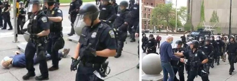 وأثار مقطع الفيديو الذي صور خلال تظاهرة الأسبوع الماضي في مدينة بافالو احتجاجا على عنف الشرطة ضد السود، موجة استنكار في الولايات المتحدة، ويظهر في المقطع شرطيّان يدفعان رجلا في الـ75 من العمر يدعى مارتن غوجينو، فيسقط أرضا ويرتطم رأسه بالرصيف أمام مجموعة من العناصر الأمنية دون أن يتحركوا لمساعدته.