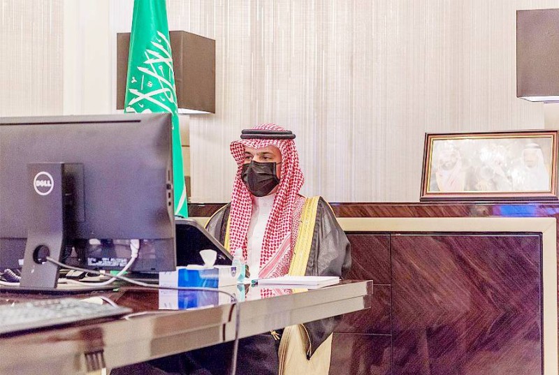 وزير الخارجية الأمير فيصل بن فرحان خلال مشاركته في اجتماع مجلس الجامعة «الافتراضي» الطارئ أمس. (واس)