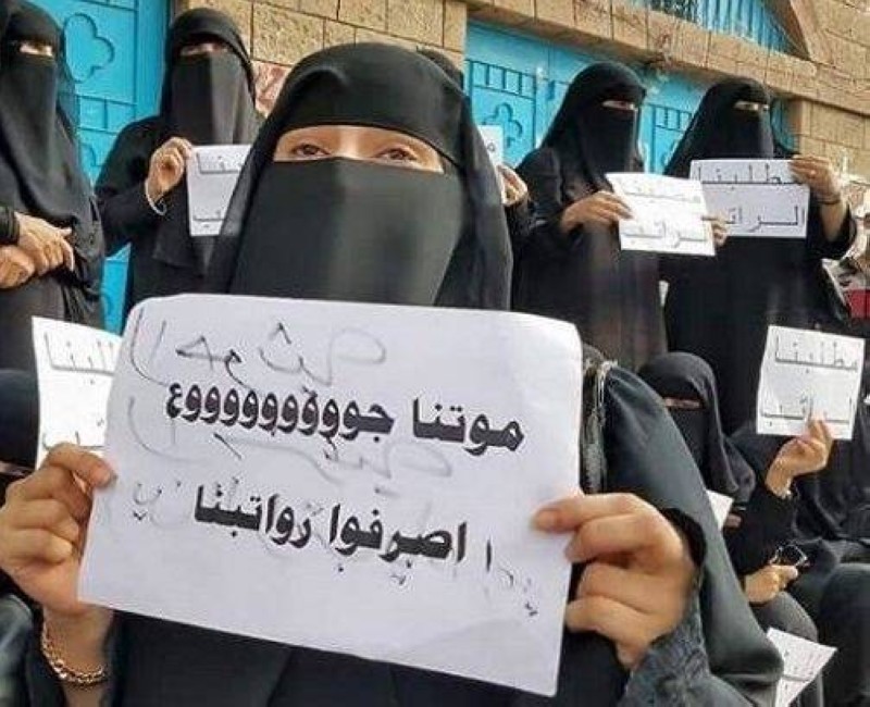 معلمات تطالبن المليشيا بصرف مرتباتهم في صنعاء.