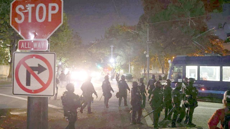 الشرطة الأمريكية تواجه محتجين في بورتلاند أمس.
