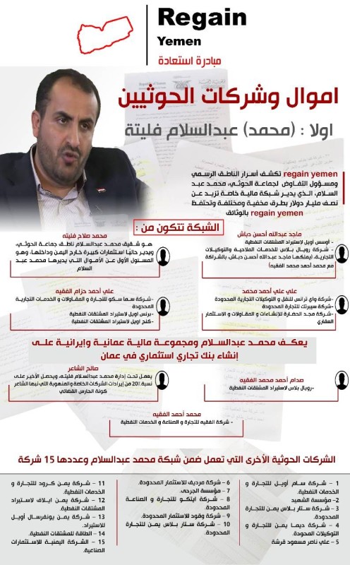 وأفصح التقرير عن أسماء عدد من الشخصيات التي تعمل مع متحدث الحوثي في نهب المال العام اليمني، إذ أظهر التقرير أن غالبية الأسماء تعمل على إدارة شركات نفطية وأخرى تجارية وملاحية ومقاولات عامة.