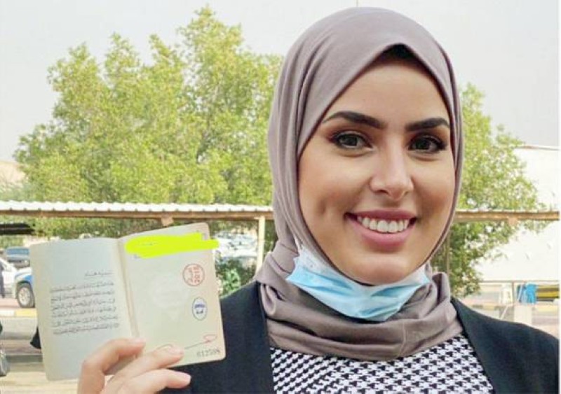 نائبة رئيس مجلس إدارة جمعية الكاريكاتير الكويتية سارة فرحان عقب إدلائها بصوتها أمس. (عكاظ)