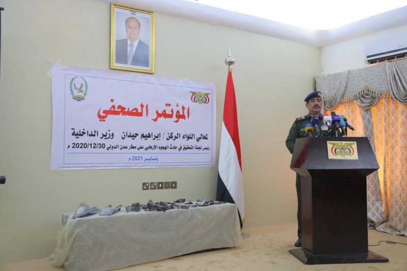 وعرض حيدان على الصحفيين بقايا الصواريخ التي أطلقتها المليشيا على مطار عدن الدولي والتي تؤكد أنها بالستية. وكان ناشطون يمنيون رصدوا إطلاق المليشيا صواريخ من مطار تعز الدولي وأخرى من معسكر الشرطة العسكرية في محافظة ذمار نحو محافظة عدن في 30 ديسمبر أثناء وصول الحكومة اليمنية إلى مطار عدن الدولي التي كان في استقبالها عدد من المواطنين الفرحين بعودة الدولة والحياة معها إلى مدينتهم بعد أكثر من عام من المعاناة والأزمات الخانقة التي عصفت بهم، ما تسبب في مقتل عدد من المستقبلين ومسؤولين حكوميين وأمنيين.