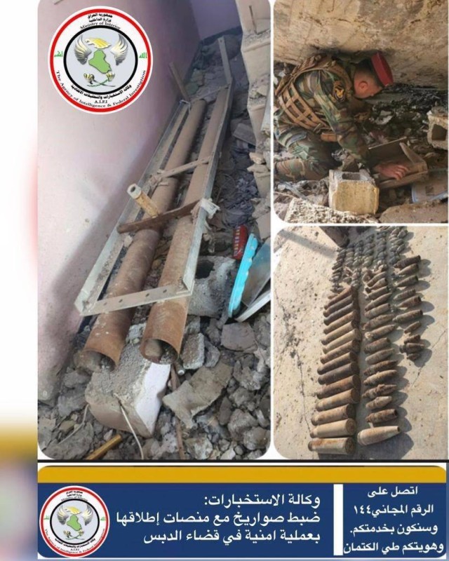 وقالت الاستخبارات في بيان لها إن مفارزها المتمثلة بمديرية استخبارات الشرطة الاتحادية في وزارة الداخلية تمكنت من تنفيذ عملية استخباراتية في قضاء الدبس بمحافظة كركوك نتج عنها ضبط منصتين لإطلاق الصواريخ و6 صواريخ متوسطة المدى إضافة إلى العديد من الأسلحة والذخائر والقذائف. وأعلنت العثور على تجهيزات عسكرية مختلفة داخل أحد المنازل الفارغة في قرية السدرة التابعة للقضاء أعلاه من مخلفات عصابات داعش الإرهابية.