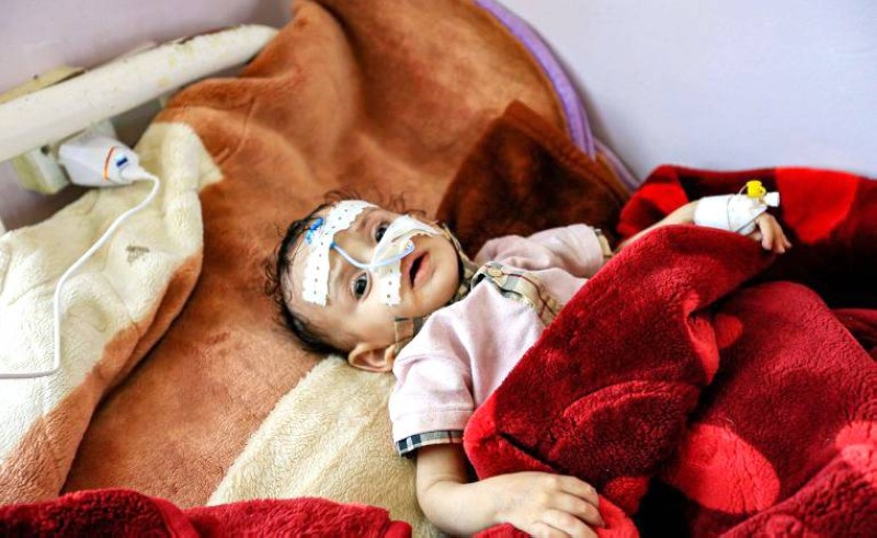 طفل يمني مريض جراء منع الحوثي وصول الأدوية للمدن.