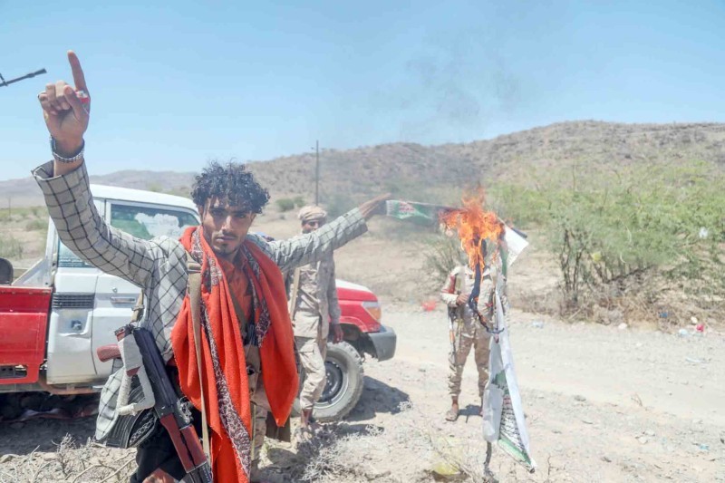أفراد من المقاومة يحرقون شعارات الحوثي في غربي تعز.