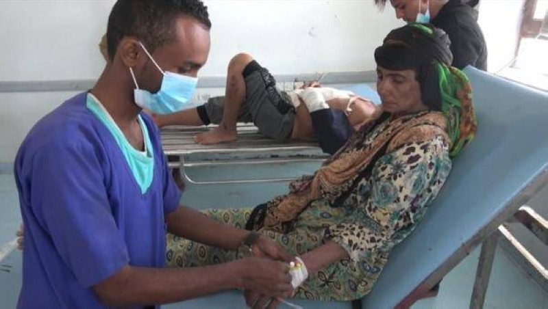 مسنة تتلقى العلاج جراء إصابتها بصواريخ الحوثي