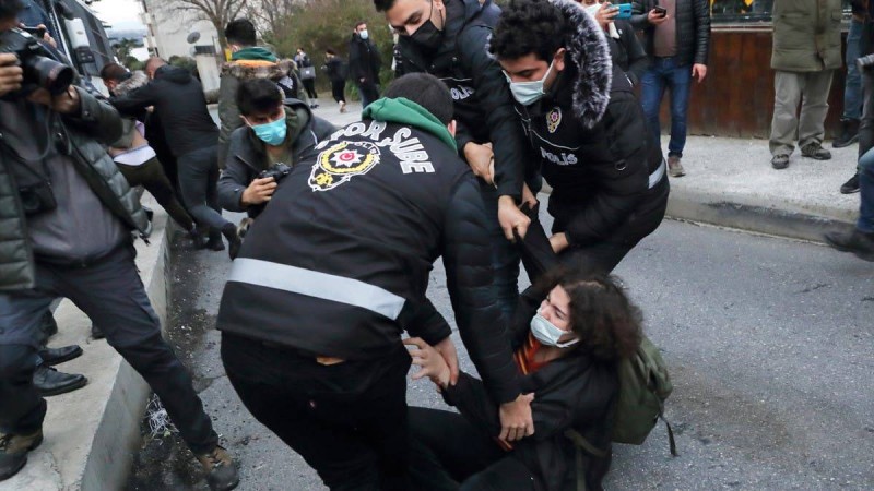 الشرطة التركية تعتقل امرأة تحتج على نظام أردوغان.