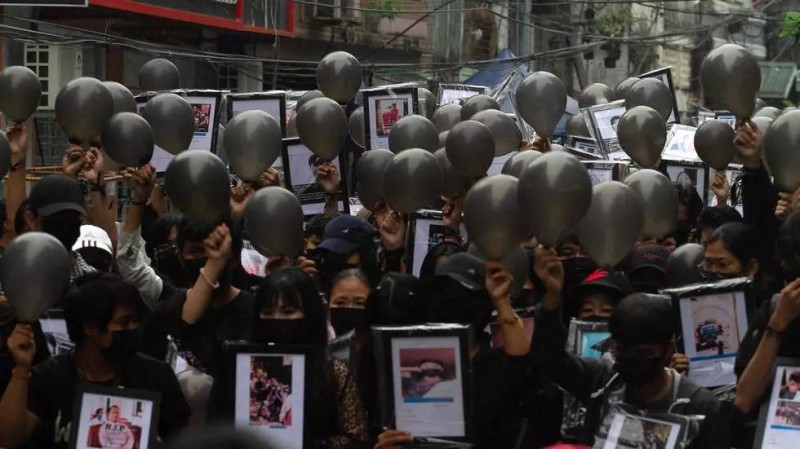 محتجون في بورما يرفعون صوراً لضحايا هجمات الانقلابيين خلال الأيام الماضية.