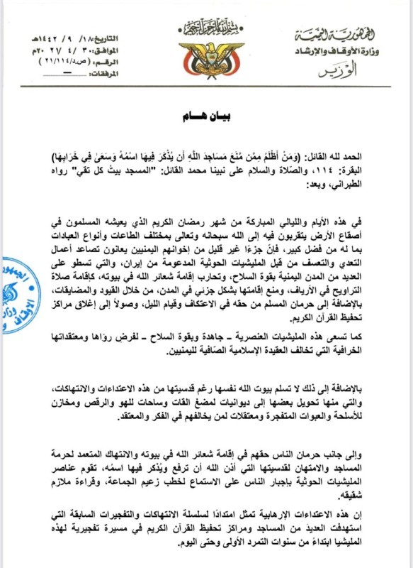 استنكرت وزارة الأوقاف اليمنية أعمال التعسف والاعتداء من قبل المليشيات الحوثية المدعومة من إيران، والتي منعتهم من العبادة في رمضان.