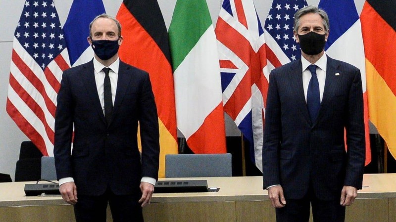 في إطار أول اجتماع حضوري لوزراء خارجية دول مجموعة السبع منذ بدء تفشي وباء كورونا، وعلى جدول أعماله الانتعاش الاقتصادي ومكافحة المخاطر الجديدة، التقى وزيرا الخارجية الأمريكي أنتوني بلينكن والبريطاني دومينيك راب اليوم (الاثنين) في لندن.
