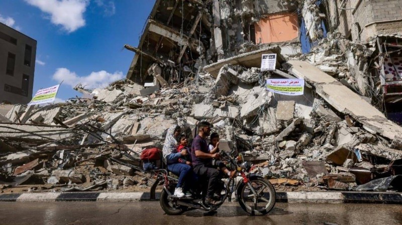 أسرة فلسطينية على متن دراجة بخارية تمر بجوار مبان دمرتها إسرائيل في غزة.
