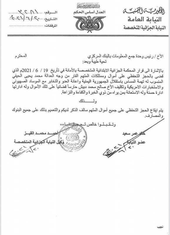 وظهر الحيفي في شريط فيديو مصور طالب فيه زعيم المليشيا بوقف عصاباته عن ممارسات السطو على ممتلكاته، وقال إن القيادات الحوثية وجهت له عددا من التهم منها أنه هارب خارج اليمن رغم أنه موجود في صنعاء ثم وجهوا له تهمة أن منزله الذي استولوا عليه تابع لنائب الرئيس اليمني علي محسن الأحمر، ثم عادوا ليقولوا إنه كان مسكناً للسفير الأمريكي، مؤكدا أن كل هذه أكاذيب. وأضاف: «الحوثيون اتهموني بأني جاسوس وعميل لأمريكا ومع الشرعية والتحالف ضدهم».